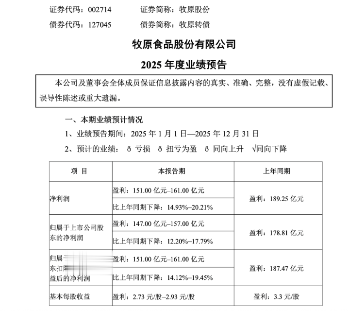 据牧原股份近日发布的2025年度业绩预告,预计全年实现净利润147亿元-157亿元,比上年同期下降12.20%-17.79%,预计归属于上市公司股东扣除非经常性损益后的净利润151亿元-161亿元。牧原股份在公告中表示,2025年受生猪市场行情波动影响,全年商品猪销售均价约13.5元/公斤,同比下降约17.3%,使得公司整体盈利水平较上年同期有所下滑。
